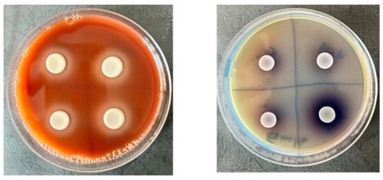 The production of soluble virulence factors by C. auris strains, specifically metabolic enzymes (amylase, hemolysins, aesculin hydrolysis, caseinases, and lecithinase), was assessed using the established solid culture media protocols. For hemolysin activity, C. auris isolates were cultured on an SDA supplemented with 5% sheep blood, where hemolysin production was identified by the appearance of a clear, colorless halo surrounding the colonies after 24 h of incubation at 37 °C. Egg yolk agar (2.5%), which was used to test lecithinase activity, showed positive results when a clear zone formed around the inoculum after 24 h of incubation at 37 °C. Caseinase activity was tested on an agar that had 15% soluble casein. After 24 h at 37 °C, the presence of a white precipitate around the colonies showed that the enzyme was active. Amylase production was determined using a starch agar (1%), where, upon the addition of Lugol’s iodine solution (Sigma-Aldrich, St. Louis, MO, USA), a yellow halo around the colonies signified starch hydrolysis, contrasting with the blue coloration of the remaining medium. Aesculin hydrolysis was tested on an agar supplemented with Fe3+ citrate. Positive activity was indicated by a black precipitate forming around the colonies after 24 h of incubation at 37 °C [62,63]. This method offers a thorough evaluation of the enzymatic virulence factors linked to C. auris, enhancing the understanding of its pathogenic mechanisms.