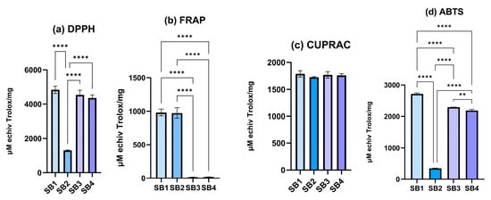 Comparative antioxidant activity between SB1, SB2, SB3, and SB4 obtained through DPPH (a), FRAP (b), CUPRAC (c), and TEAC (d) assays. (** p < 0.01, **** p < 0.0001).