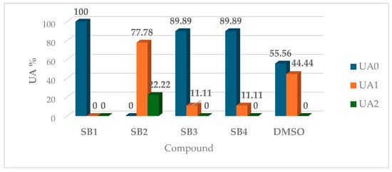 The antifungal activity of the investigated compounds was assessed and classified based on their inhibitory potential, assigned as arbitrary units (UAs), as illustrated in Figure 4. Among the evaluated derivatives, SB2 demonstrated the highest efficacy, being the only compound to inhibit all tested strains, with inhibition rates ranging from 22.22% for UA2 to 77.78% for UA1. Compounds SB3 and SB4 displayed comparable antimicrobial activity, each achieving an inhibition rate of 11.11% against UA1. In contrast, SB1 exhibited no inhibitory effect against any of the nine tested strains, resulting in a UA0 classification across 100% of the cases.
