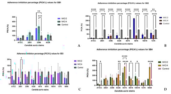 Adherence inhibition percentage (PICA%) values for SB1, SB2, SB3, and SB4 compared to the C. auris strains: (A) PICA% values for SB1 showing the highest inhibition against strain 3396 at both MIC/2 and MIC/4 concentrations; (B) PICA% values for SB2 revealing strong inhibition activity at MIC/2 and MIC/4 across most strains, particularly against 4574 and 6816; (C) PICA% values for SB3 indicating moderate and uniform adherence inhibition across all strains tested, with significant effects against DSM and 2851; (D) PICA% values for SB4 highlighting potent inhibition for several strains, especially 9069, 6816, and 4574, with statistically significant differences compared to the control. (* p < 0.05, ** p < 0.001, *** p < 0.001, **** p < 0.0001) (Dunnett’s multiple comparisons test).
