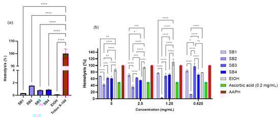 Anti-hemolytic activity of newly synthesized compounds: (a) hemolysis (%) induced by SB1, SB2, SB3, SB4, and ethanol 70% relating to Trypton X-100 and (b) antihemolytic activity of these compounds against the AAPH-induced oxidative hemolysis of ram erythrocytes (* p < 0.05, ** p < 0.01, *** p < 0.001, **** p < 0.0001).