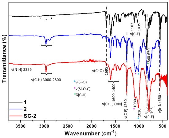 Figure 2 shows the IR spectra of complexes 1, 2 and the ionosilica SC-2, showing in all the cases the appearance of a P-F stretching vibration at ca. 800 cm−1, indicative of the presence of PF6− anions. According to the imination process of the aldehyde groups of complex 1 (SI, Scheme S2), there are several differences between the spectra of complexes 1 and 2. For instance, the disappearance of the ν(C=O) band at 1963 cm−1 observed for complex 1 and the appearance in the spectrum of complex 2 of more intense signals in the high-energy region (around 2950 cm−1), attributed to the C–H stretching vibrations of aliphatic groups, as well as two very strong absorptions corresponding to the stretching vibrations of Si–O–C (1071 cm−1) and Si–O (1006 cm−1) bonds. As expected, the IR spectrum of the self-condensed material SC-2 is quite similar to that observed for complex 2, indicating that the cyclometalated Ir(III) cations retain their structure during the condensation process. Analogous to the synthesis of a related ionosilica based on complex [Ir(dfppy)2(dasipy)]PF6, recently reported by our group [26], the main difference between the spectra of complex 2 and material SC-2 is the significant weakness of the absorption bands related to Si–O–C bonds in the material. Since SC-2 consists of self-condensed molecules of complex 2, each containing six ethoxide groups susceptible to hydrolysis and condensation, it is highly probable that not all these groups undergo complete hydrolysis to form Si–O–Si bonds. Indeed, these reactions may not occur to the same extent in all molecules. Scheme 1 therefore represents an average molecular model of this material. Under these conditions, the hydrolysis of two ethoxide groups per triethoxysilane moiety is assumed, resulting in a material with the empirical formula C48H42F10IrN8O4Si2P, considering the presence of the PF6− anion. This empirical formula agrees with the elemental analysis results, which consistently give values corresponding to the presence of eight water molecules per cationic unit (see Experimental Section in SI). Finally, the preservation of the structural integrity of the cationic organometallic fragments is in agreement with the MALDI(+) spectrum in the solid state, which shows a signal at m/z 1065 consistent with the isotopic distribution of the ionization fragment [SC-2 − {(CH2)3Si(OEt)3} + 3H]+. It should be noted that the MALDI(−) spectrum also shows a signal at m/z 145 corresponding to the presence of the PF6− anion (see SI, Figure S3).