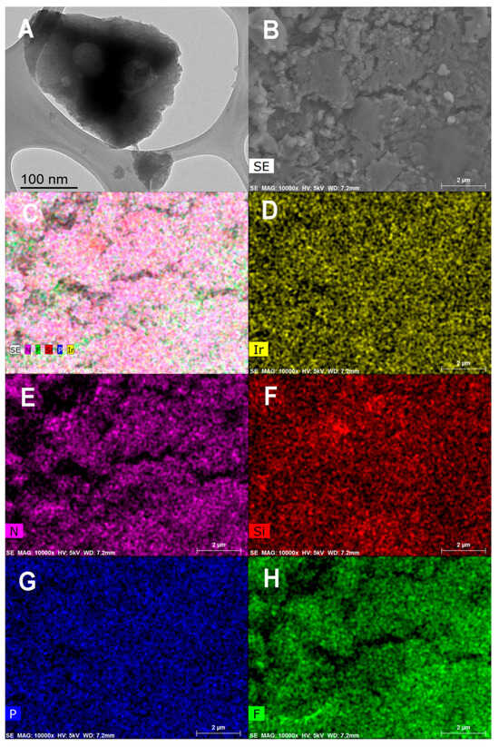 Representative TEM ((A), scale bar = 100 nm) and FESEM ((B), scale bar = 2 µm) images of the self-condensed material SC-2, with the corresponding layered image (C) combining the FESEM-EDX elemental mapping images of Ir (D), N (E), Si (F), P (G), and F (H) (scale bar in C–H = 2 µm).
