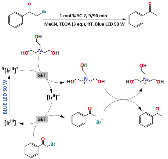 Photocatalytic dehalogenation of 2-bromoacetophenone (up) and mechanism of the reaction (down).
