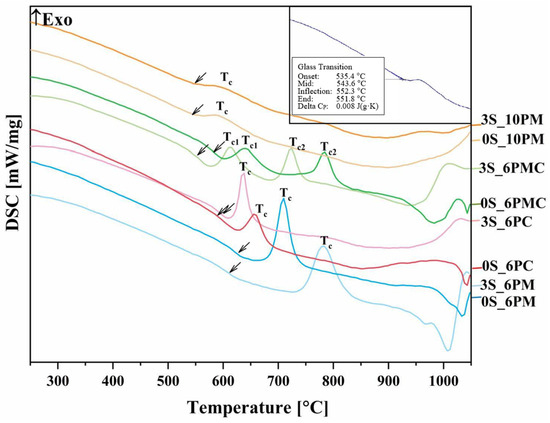 Figure 2 presents the DSC curves, revealing a glass transition followed by a single-stage crystallization event for all glass compositions, except for the system containing both CaO and MgO as alkaline earth modifiers—in this case, two exothermic peaks are observed, reflecting the multicomponent nature of this particular formulation. Notably, while the glass transition and crystallization events in the [6P] series are well-defined, these effects appear significantly less distinct in the [10P] system.
