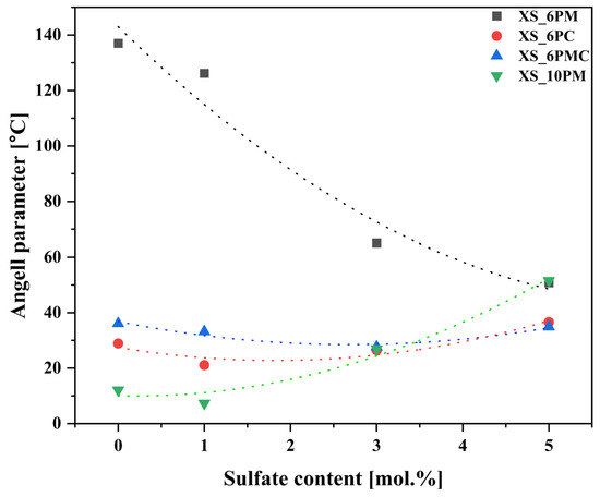 Meanwhile, introducing both alkaline earth network modifiers into the system placed the XS_6PMC glasses between the XS_6PM and XS_6PC compositions in terms of thermal stability parameters but simultaneously results in lower registered Tg values (Table 1). The intermediate KA values relative to the endpoint compositions are understandable and can be directly attributed to the network-forming capabilities of Mg2+ as well as its stronger bond to oxygen, which is expected given the higher field strength and smaller ionic radius of magnesium compared to calcium. However, the cause of the more than 50 °C lower Tg values for the XS_6PMC system compared to the other [6P] systems remains unclear. Drawing on the work of Kjeldsen et al. [84] and Swansbury et al. [70], it is plausible to hypothesize that this phenomenon may be linked to the mixed alkaline earth effect (MAEE)—the coexistence of Mg2+ and Ca2+ ions appears to influence the dynamic properties of the glass, potentially impeding the cooperative rearrangement of atoms within the common framework as the system approaches the glass transition, and, subsequently, promoting structural relaxation via bond breakage during the as-accelerated glass transition [42,70,84]. It is important to discuss the impact of sulfate unit addition on the thermal stability of the tested materials, understood as their resistance to devitrification. As shown in Figure 3, the data clearly indicate that the addition of [SO42−] species increased the melt’s propensity for ordering its elements and promoting the crystallization of the amorphous material. However, this declining trend continued throughout the entire composition range only for the XS_6PM system, while for the other compositions, a threshold value of sulfate content can be identified, beyond which the trend reversed (an increase in sulfur content leads to enhanced thermal stability). This effect can be attributed to the largest proportion of the amorphous phase in the XS_6PM composition (see Figure 1 as well as the authors’ previous studies on akin materials [79,81])—the absence of a stabilizing crystalline phase led to a gradual weakening of the glass’s internal structure with the introduction of sulfate units, which, by augmenting the number of covalent bonds, progressively increased the rigidity of the internal framework and enhance the system’s tendency for ordering due to bond breaking. While this phenomenon was observed in all studied systems upon the initial addition of [SO42−], the increasing network ordering along with sulfur content in the remaining compositions (evidenced by distinct reflections in the XRD patterns for XS_6PC and XS_6PMC systems at 5 mol.% nominal SO3 content and for the [10P] system, already in the base sample, see [81] as well as Figure 1) led to an improvement in thermal stability, as reflected by the inversion of the trend (a higher energy barrier for the transformation from a glassy to a crystalline state).