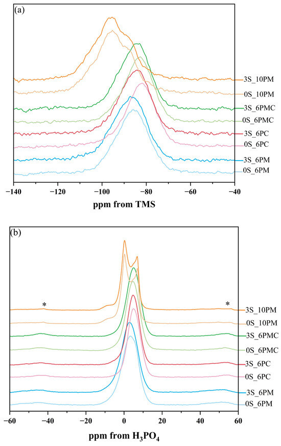 Therefore, to assess the potential of the designed glasses as vitreous carriers of beneficial ions, 29Si and 31P MAS-NMR spectroscopy was employed to characterize the vitreous framework of the tested systems. The compilation of MAS-NMR spectra comparing the chemical environments of the network formers in both studied systems ([6P] and [10P]) is presented in Figure 4a (29Si MAS-NMR) as well as Figure 4b (31P MAS-NMR), respectively.