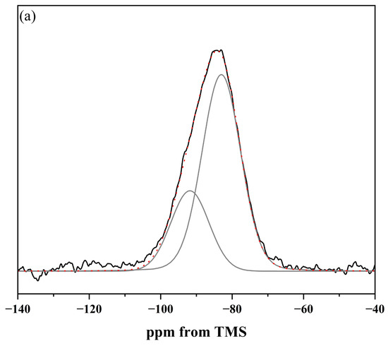 Therefore, to extract the data necessary for calculations based on Equations (1)–(3) and asses the relative abundance of individual structural units within the glass network as well as the impact of sulfate species’ addition on their distribution, the obtained signals were subjected to a deconvolution procedure. Accordingly, spectral regions were fitted with a set of bands modeled using the Voigt function, which was deemed optimal for approximating most NMR signals. The only exception was the 31P MAS-NMR spectra recorded for the [10P] system, where narrow, well-defined resonances were best described by the Lorentzian function. Representative deconvolution results for selected samples from the XS_6PMC system are presented in Figure 5, while a comparison of network connectivity calculations for all glass samples from both studied systems is depicted in Figure 6.