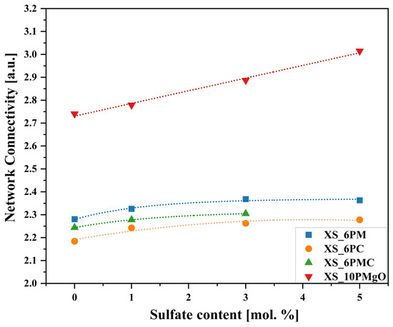 Figure 6. Calculated network connectivity values for the studied glass compositions. The data are plotted against the nominal SO3 content, used here solely to distinguish between the samples. Please note that these values do not represent experimentally measured sulfur concentrations, which are provided in Table 3 (see Section 4.1). The NC value for the 5S_6PMC glass is not available due to the specimen’s instability, which prevented the acquisition of both 29Si and 31P MAS NMR spectra.