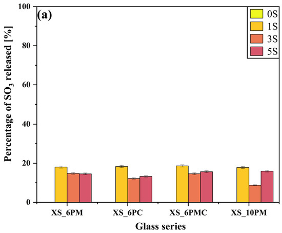 Although the network-polymerizing influence of [SO42−] species is also reflected in the release of other glass components of [6P] glasses into the surrounding medium (Figure 7 and Figure 9a,b), it is most pronounced in the data presenting silica release (Figure 7), where a sharp decline in SiO2 concentration in the leachate was observed for all glasses beyond the threshold of 1 mol.% SO3 (dropping from an average of 6% to just ~1% of the initial content). Numerous scientific reports identify ~1 mol.% SO3 as the maximum amount that can be accommodated within the free volume of a silicate-based vitreous framework without triggering crystalline phase precipitation [114,115]. Therefore, a certain correlation can be established between the solubility limits reported in the literature and the data presented in Figure 7. In the systems studied, the precipitation of K2SO4 as a sulfate-bearing phase was observed at 5 mol.% SO3 in both melt-quenched and fritted XS_6PM samples [80], whereas for XS_6PC and XS_6PMC compositions, crystallization occurred at 3 mol.% in melt-quenched glasses, with the fritting process extending this limit to 5 mol.% [79,81].