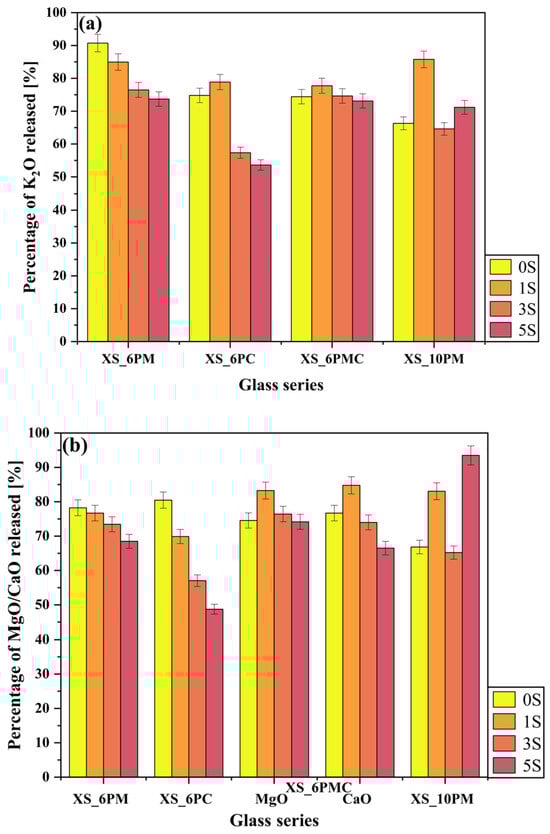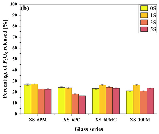Importantly, the experiment allowed for assessing the effect of glass composition on sulfate ion release into the surrounding medium. The data presented in Figure 8a indicate that, within the [6P] system, the type of alkaline earth metal oxide modifying the glass matrix had a negligible effect on the release of [SO42−] species into the solution, with leached amounts ranging from 10% to 20% of the initial content. Instead, the previously demonstrated network-polymerizing effect induced by sulfate incorporation appears to play a more significant role (see Section 2.1 and [80,81]). Notably, in all systems containing 6 mol.% P2O5, an increase in [SO42−] ion content correlates with a reduced release of this species into the solution. A similar, albeit substantially less pronounced, trend was observed for phosphate ion release (Figure 8b), further supporting the sulfate-induced polymerization effect. However, in this case, the difference between the maximum (~26% for glasses containing ~1 mol.% sulfates) and minimum (~20% for 5S glasses) phosphate release was less significant than the one observed for [SO42−]. The release of both anions into the surrounding medium primarily occurs via the hydrolysis of S-O-K+ and P-O-K+/Mg2+/Ca2+ bonds, which is strongly promoted by ion exchange in the acidic environment of the citric acid solution [111,112,113]. This process leads to the protonation of phosphate and sulfate units into H2PO4/HPO42− and HSO4, respectively. The sulfate-induced densification of the glass network, therefore, acts as a kinetic barrier, restricting the transport of these relatively large anions to the glass–solution interface. Consequently, the observed leached ion concentrations primarily originate from near-surface regions rather than the glass bulk.