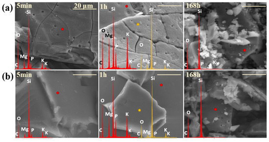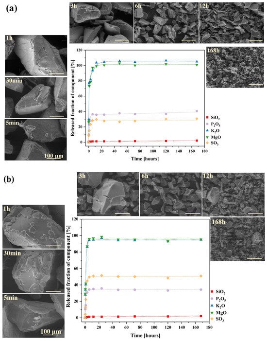 Figure 11. Ion dissolution profiles of 3S_6PM (a) and 3S_10PM (b) glasses in 2% citric acid under dynamic leaching conditions as a function of immersion time, accompanied by micrographs from selected surface points, illustrating surface changes at various stages of the experiment. It should be stressed that the percentages of K2O and P2O5 released in the case of XS_6PM system were noted to slightly exceed 100% due to the limitations of the XRF analysis (in the pearl method used, the samples were heated to 1100 °C, potentially leading to the volatility of certain glass components and resulting in inaccuracies in the measured values). The micrographs were taken at 1000× magnification, with the scale bar corresponding to 100 µm.