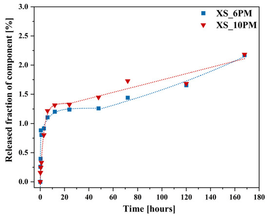 The concept of vitreous fertilizers is based on the controlled release of nutrients in response to plant demand. This interaction between the rhizosphere, soil microorganisms, and the macro-/micronutrient carrier relies on the secretion of low-molecular-weight organic acids, which mobilize elements encapsulated within the glass matrix [52,109,110]. Therefore, to assess the leaching behavior of the designed materials in relation to their chemical composition, an ‘in vitro’ experiment was conducted using a solution that simulates these organic exudates, and the results are presented in Figure 7, Figure 8, Figure 9, Figure 10 and Figure 11.