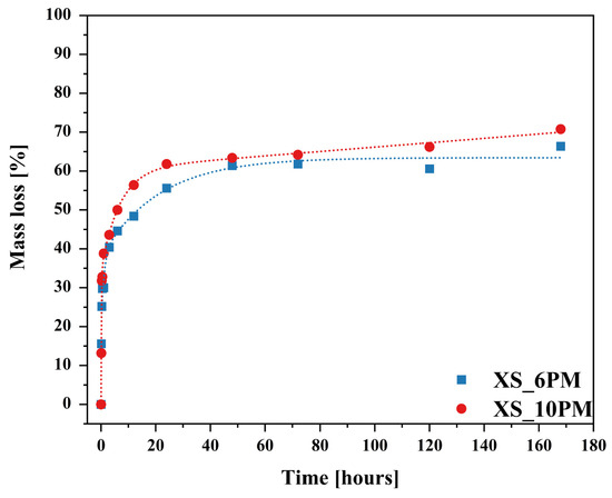 Analyzing the ‘in vitro’ experimental data, it is worth noting a few cases where an initial increase in the release of a given element (e.g., K+ in the case of sample 1S_6PC) was observed compared to the base sample, followed by a subsequent decline. This phenomenon can likely be attributed to a slight expanding effect of [SO42−] species on the glass matrix, as these units become localized within its structural voids, thereby facilitating deeper water penetration [59]. However, in later stages, this effect was gradually outweighed by the network-polymerizing influence of sulfate species.