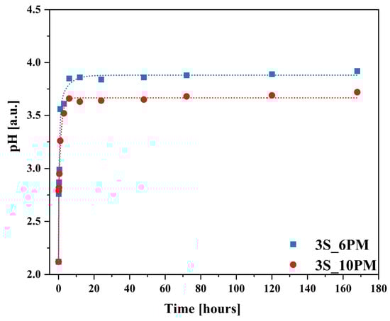 This assumption leads to the conclusion that the sulfate ions released in such large quantities also originate from the outermost layers of the samples, suggesting at the same time a non-uniform distribution of sulfate units within the glass volume. This interpretation aligns with literature reports describing the tendency of sulfates to form a so-called ‘sulfate gall’ on the surface of silicate melts [114,120,121,122], further supporting the notion of [SO42−] species migrating toward the surface [123]. Moreover, the highest sulfate ion concentrations were detected in the filtrates of the 3S_6PC and 3S_6PMC samples, whose melts exhibited the lowest viscosities, potentially facilitating the migration of sulfur species towards the surface. Finally, it is crucial to emphasize the inherently high solubility of sulfate ions in aqueous environments, which, combined with their presence in the glass matrix as isolated units unbound to the network, further enhances the mobility of sulfur species into the surrounding medium [124,125].