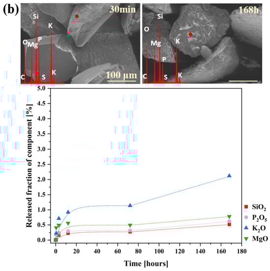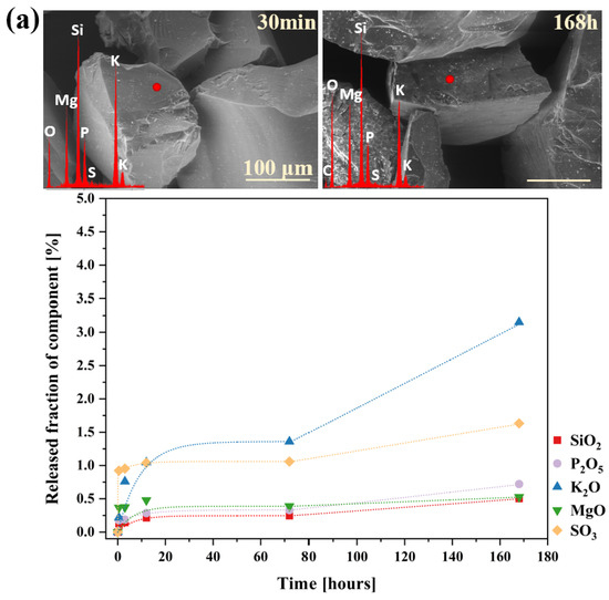 The shape of the corrosion kinetic curves obtained for both analyzed systems reflects two well-known kinetic regimes in glass dissolution studies in aqueous solutions [57,128,129], as shown in Figure 11a,b. The initial, highly intensive release of mobile species (K+, Mg2+) is associated with interdiffusion, where these cations undergo ion exchange with H+/H3O+ from the contacting solution, leaving the near-surface region of the glass depleted of these elements. The recorded release profiles of the network modifiers follow a t   1 2 dependence, a clear indicator of a transport-controlled process [130,131,132]. Surprisingly, larger PO43− and SO42− ions, which do not participate in proton exchange, are released following the same trend. Their initially rapid leaching can be attributed to their structural role in the glass matrix, where they exist as isolated units rather than being integrated into the silicate-based network; hence, their dissolution does not require the hydrolysis of silicon-oxygen bonds [59,133].