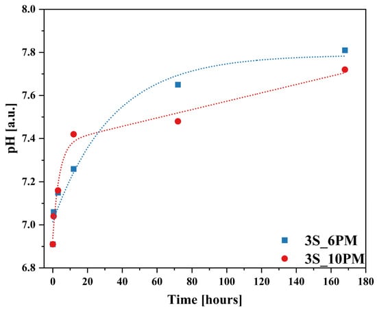 Considering these criteria, along with the analogous behavior observed for all [6P] glasses in the ‘in vitro’ experiment, the glasses 3S_6PM and 3S_10PM—both containing MgO as an alkaline earth metal modifier—were selected for further study. This selection enables the investigation of phosphorus content effects on dissolution kinetics while minimizing potential influences arising from variations in the characteristics of network-modifying cations on the release rate of glass components into the solution.