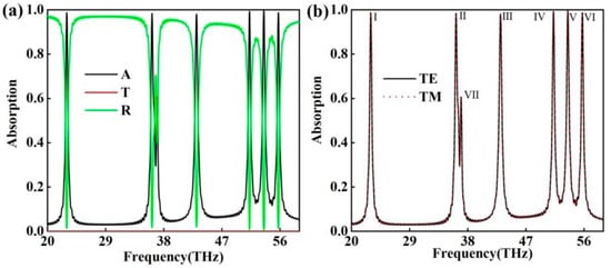 As shown in Figure 1a, the transmittance was on the order of 10−9, which was so small that it was negligible. This is because the thickness of the gold layer was much larger than the skin depth of the electromagnetic wave in the gold element, resulting in the electromagnetic wave not being able to penetrate the gold layer. The absorber showed seven absorption peaks, which were named I, II, III, IV, V, VI, and VII in Figure 1a. The corresponding resonance frequencies from absorption peak I to VII were 22.9729, 36.1962, 43.0849, 51.2742, 53.4902, 55.7543, and 36.967 THz, and the corresponding absorption rates were 0.98717, 0.98364, 0.98027, 0.99311, 0.99646, 0.98704, and 0.60649, respectively. Since the absorption rate of absorption peak VII was lower than 90%, it had limited influence on the performance of the device, and will not be discussed in the following.