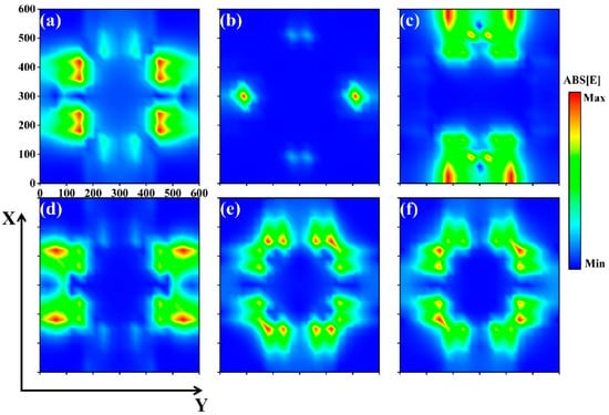 As shown in Figure 2, the electric field intensity distribution of the absorber was presented at the resonance frequencies of the six absorption peaks. In absorption peak I, the electric field intensity mainly gathered in the left and right concave protrusion of the edge of the region; in absorption peak II, the electric field intensity was mainly distributed in the left and right concave edge of the region; absorption peak III of the electric field intensity concentrated in the upper and lower concave edge of the two sides of the region and the edge of the concave area; for absorption peak IV, the electric field intensity was located mainly in the left and right concave edge of the two sides of the region; for absorption peak V, the electric field intensity was mainly distributed in the region close to the protrusion of the upper and lower concave zigzags and the protrusion of the left and right concave zigzags [27,28]; and the electric field intensity of absorption peak VI was roughly distributed in the diagonally flipped symmetry. The electric field intensity of absorption peak IV is mainly located in the edge area on both sides of the concave zigzag.