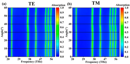 As shown in Figure 3, the insensitivity of the absorber to the angle of incidence is critical in practical applications. In real-world environments, absorbers are difficult to place in ideal optical conditions. The angular scanning plot starts at 0 degrees and scans the angle of incidence in 10-degree steps. It can be seen that in the case of TE waves, the absorption peaks in the absorption spectrum remained high at over 90% absorption when the incident angle was in the range of 0–50°. The angular scan plot for TM waves was highly similar to that for the TE waves. At the same time, the resonance frequency of the absorption peaks changed slightly as the angle of incidence increased. Based on this characteristic, the absorber can be used in applications such as the angular calibration of line light sources, which shows good prospects in reality [31,32,33].