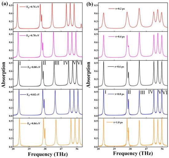 (a) Absorption spectrum of the absorber at different Fermi levels of graphene, and (b) absorption spectrum of the absorber at differentrelaxation time of graphene.