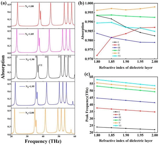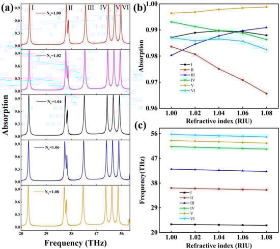 Figure 5a shows the effect of the refractive index of the dielectric layer SiO2 on the absorption spectrum of the absorber. As shown in Figure 5b, the effect of the refractive index of the dielectric layer on the absorbance of the absorption peak was disordered and small, and the variation range of each absorption peak was as follows: I—0.9825–0.9934, 1.1%; II—0.9719–0.9870, 1.53%; III—0.9789–0.9838, 0.5%; IV—0.9924–0.9937, 0.13%; V—0.9962–0.9981, 0.19%; VI—0.9849–0.9897, 0.48%). This indicates that the refractive index of the dielectric layer has very little effect on the absorption rate of the absorber. As shown in Figure 5c, the resonance frequency of the absorption peak showed a linear relationship with the refractive index of the dielectric layer. Through the data analysis, the fitting of the refractive index () and the resonance frequency () using a linear function was obtained: