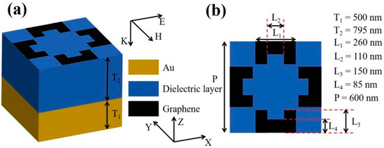 The middle layer used a material of SiO2 with a refractive index of 1.9. The pattern of the top graphene was a four-concave shape (or two H shape), as shown in Figure 7b. The dielectric constant of the monolayer graphene is [62,63]: