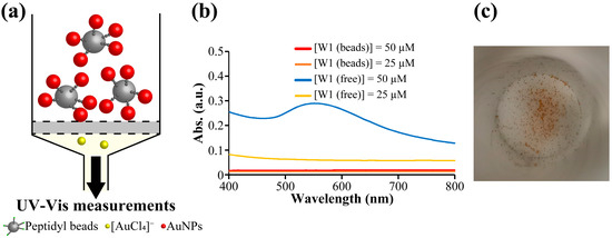 We prepared AuNPs using W1-beads or W1 solution (free W1). In case of W1-beads, the procedure in Figure 1b was performed. AuNPs were prepared on W1-beads or with free W1 using [HAuCl4] = 100 µM and [W1 (beads)] or [W1 (free)] = 25 and 50 µM, which have been shown to form AuNPs in previous studies [18], and were compared using UV-Vis measurements (Figure 2). The concentration of W1-beads was calculated from the moles of peptide on the beads in the sample divided by the volume of the sample. With the free W1, SPR-derived absorbance of AuNPs was observed at approximately 520 nm, and the absorbance of 25 µM was much lower than that of 50 µM as previously shown in Ref. [18]. (Figure 2b). In contrast, no SPR-derived absorption of AuNPs was observed for using peptidyl beads (Figure 2b). This suggests that AuNPs formed by the reduction in Au ions using the peptide were retained on the W1-beads under [W1 (beads)] = 50 µM. In case of [W1 (beads)] = 25 µM, although UV-Vis results showed poor suggestion, it could be seen by the naked eye that the beads turned red (Figure 2c). This also suggests the beads also turned red in the [W1 (beads)] = 25 µM, suggesting the formation of AuNPs on the W1-beads. Therefore, we treated W1-beads and Ac-beads with aqua regia after the reaction with [HAuCl4] = 100 µM and [W1 (beads)] = 25 µM and quantified the amount of reduced Au ions using an inductively coupled plasma-atomic emission spectroscopy (ICP-AES) measurement. As a result, Au was detected under the condition of W1-beads and almost none under the condition of Ac-beads (Figure S2). Therefore, it is clear that Au ions were reduced on the W1-beads.