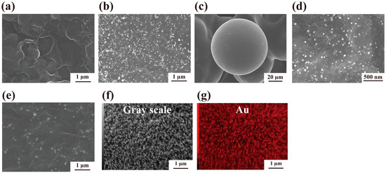 (a) SEM image of W1-beads before the Au ion reduction reaction. (b–e) SEM images of the sample after the Au ion reduction reaction using 25 µM of (b–d) W1-beads and (e) Ac-beads with 100 µM of HAuCl4. (f,g) SEM and SEM-EDX mapping images of the sample after the Au ion reduction reaction.