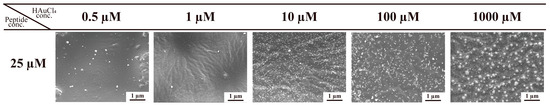 SEM images of the sample after the Au ion reduction reaction using 25 µM of W1-beads and 0.5–1000 µM of HAuCl4.