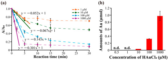 (a) Catalytic reaction progression of immobilized AuNPs prepared using W1-beads. Progression in immobilized AuNPs prepared under various conditions from 0 to 30 min. (b) Quantitative analysis of Au immobilized on W1-beads using ICP-AES measurement. n.d.: Detected values were less than 0.01 µmol.
