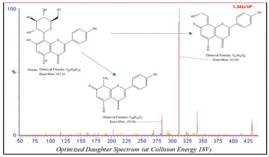 A mixture of standards and internal standard at a concentration of 1 µg/mL was ana-lyzed in full-scan mode to identify the parent ions, which are deprotonated molecule ions [M − H]− losing a C4H8O4 group, at m/z 431 for both analytes under the MS/MS scan mode. The relatively weak bonds in the glucose structure make their molecules prone to break out in the collision cell, resulting in the formation of fragmented ions. Daughter ion scan mode was used to determine both quantitative and qualitative fragment ions. The most abundant product ions of isovitexin and vitexin were the result of [M–H–C4H8O4]– and [M–H–C4H8O4]−, respectively, at m/z both 311.1 (Table 1). Thus, the MRM transitions were chosen at 431.1 → 311.1 for monitoring the compounds. Fragmentations of the parent ions into daughter ions were consistent with data found in MassBank of North America (MoNA) and our proposed fragmentation mechanism (Figure 2). Fragmentation parameters and collision energy were optimized using the IntelliStart automatic optimization function of MassLynx (V4.2) software and further adjusted with Manual Tune to maximize the signal intensity of the quantitative ions.