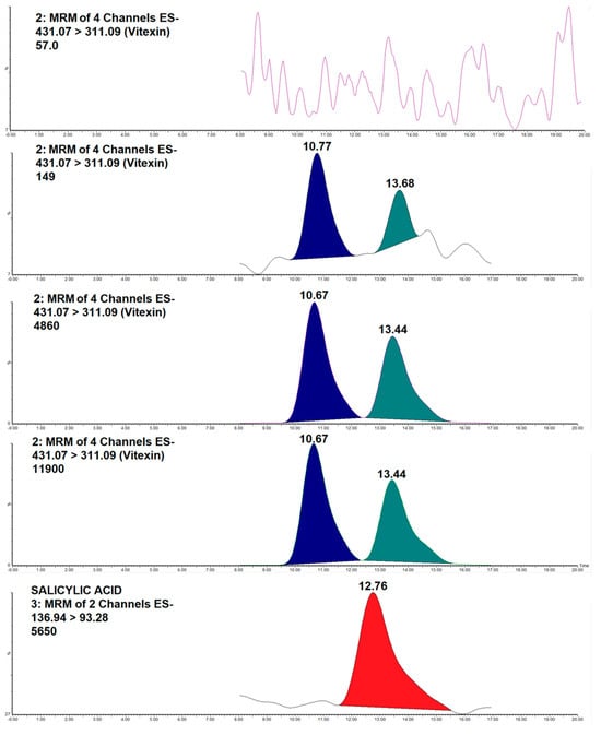 Chromatograms obtained for the transition 431 > 311 (vitexin and isovitexin) from the blank, LLOQ, MQC, and ULOQ level, and for the transition 137 > 93 (IS) at the LLOQ level.