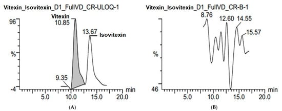 Both vitexin and isovitexin are polar flavonoid-glycoside compounds, and belong to the C-glycosylflavones. Although they share the same molecular formula, their structures differ in the position of the sugar group. Due to this structural similarity, both analytes produce the same parent ion when detected using a TripleQuad mass spectrometer with an ESI source (Waters, Milford, MA, USA). Moreover, it was observed that both compounds also generate the same fragmented ions, resulting in the same signal on the MS detector across transitions. Therefore, it is crucial to achieve separation of vitexin and isovitexin with liquid chromatography before detection to ensure accurate identification and quantification of each analyte. Theoretically, both vitexin and isovitexin are polyphenol compounds and more readily ionized in negative mode compared to positive mode. In practice, their ion intensity was indeed high in negative mode in an ESI full scan; therefore, the negative mode with an ESI source was selected as the ionization mode for this study to optimize detection sensitivity and reliability. This mode was also chosen for analyzing these compounds in the plant materials [2] as well as rat plasma [3] in previous studies.