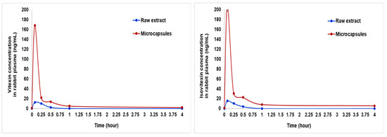 The developed method was applied to analyze biological samples extracted from rabbit plasma as a part of a simulated pharmacokinetic study on a pilot scale. As shown in Figure 5, the encapsulated form of vitexin exhibited a similar Tmax but achieved a nearly 8-fold higher Cmax compared to the raw form. Likewise, the encapsulated form of isovitexin reached a Cmax that was 10 times higher at a similar Tmax to its raw counterpart. Additionally, the time to reach Cmax for vitexin and isovitexin from the encapsulated form was faster than that observed for their extract forms [21].