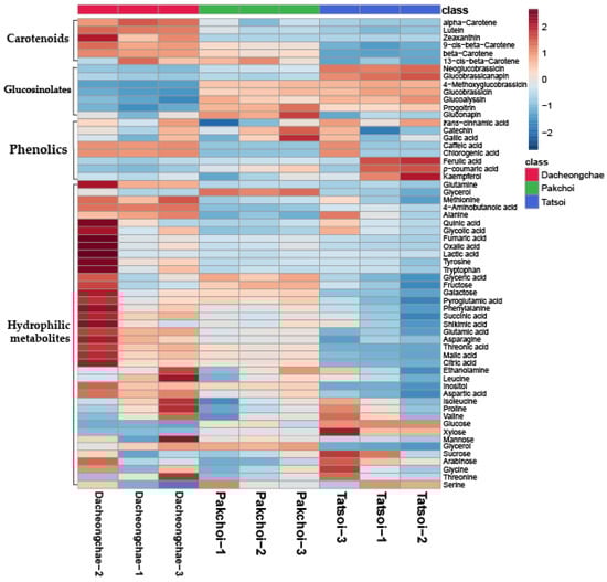 Heatmap representing differences in relative metabolite concentrations of Tatsoi, Dacheongchae, and Pakchoi.