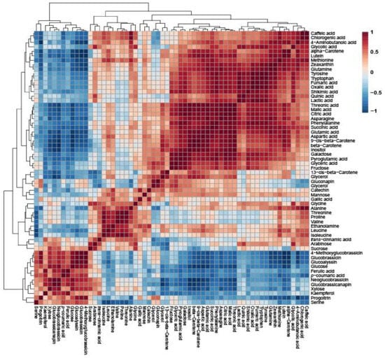 Correlation matrix obtained using 39 metabolites in Tatsoi, Dacheongchae, and Pakchoi. Each square indicates the Pearson’s correlation coefficient of a pair of compounds, and the value of the correlation coefficient is represented by the intensity of the blue or red color, as indicated on the color scale.