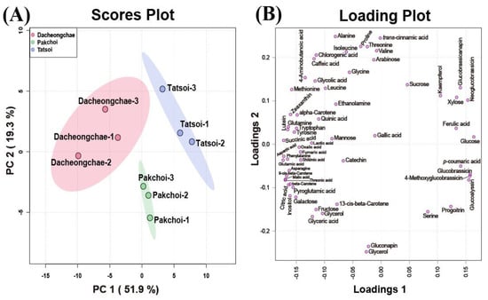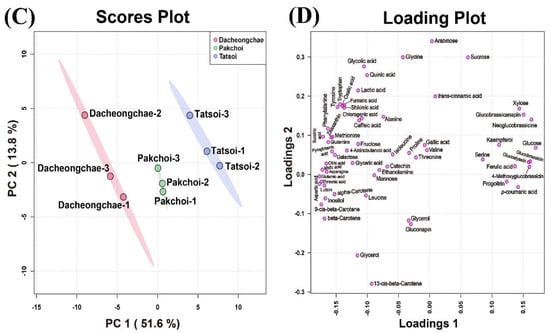 Scores (A) and loading plots (B) of the principal component analysis (PCA) model obtained from primary and secondary metabolites from Tatsoi, Dacheongchae, and Pakchoi and scores (C) and loading plots (D) of the partial least squares discriminant analysis (PLS-DA) model obtained from metabolites from Tatsoi, Dacheongchae, and Pakchoi.