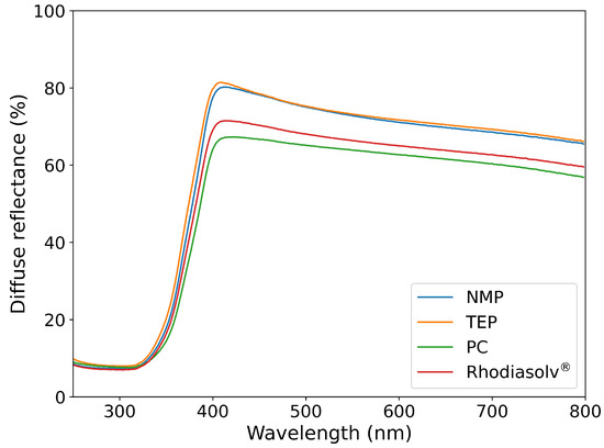 Diffuse reflectance of the PVDF/TiO2 hybrid layers, synthesized using four different solvents.