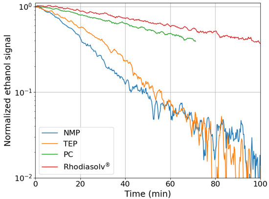 In Figure 3, the photocatalytic decomposition of ethanol is shown for samples synthesized using different solvents. The layers prepared by using NMP and TEP as solvents show a similar photocatalytic degradation of ethanol. Using the samples prepared with Rhodiasolv® and PC results in a much lower decomposition rate. From this, it can be concluded that substituting NMP with a green solvent can result in a layer that is photocatalytically active. However, decomposition rates differ significantly, so optimization of the synthesis method is necessary to also increase the decomposition rate for the Rhodiasolv® and PC synthesized samples. The differences could be attributed to a different solubility of PVDF in the different solvents. Both PC and Rhodiasolv® solutions had to be heated to 100 °C to completely dissolve PVDF. Because the casting and immersion process is still performed at room temperature, the viscosity of these cast solutions is much higher compared to the NMP and TEP solutions.