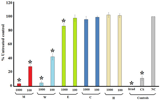 MS2 plaque formation in an F+ Amp+ E. coli lawn, expressed as % of the untreated control plaque formation following incubation of the MS2 bacteriophage with the T. ferdinandiana fruit extracts at 1000 and 100 µg/mL. M = methanolic extract; W = deionised water extract; E = ethyl acetate extract; C = chloroform extract; H = hexane extract; Irrad = microwave irradiation (positive control); CS = Camellia sinensis leaf water extract (1000 µg/mL; positive control); NC = nutrient broth (negative control). All results are reported as the mean of three assays performed in triplicate ± SEM (n = 9). * indicates statistically significant results (p < 0.01).