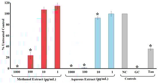 HIV-1 reverse transcriptase activity following exposure of the recombinant enzyme to varying concentrations of methanolic and aqueous T. ferdinandiana fruit extracts. The results are expressed as % of the untreated control. Tannic acid (10 μm) was included as a positive control. NC = untreated control; GC = growth control; Tan = tannic acid control. All results are reported as the mean of three independent assays performed in triplicate ± SEM (n = 9). * indicates results that are significantly lower than the untreated control (p < 0.01).