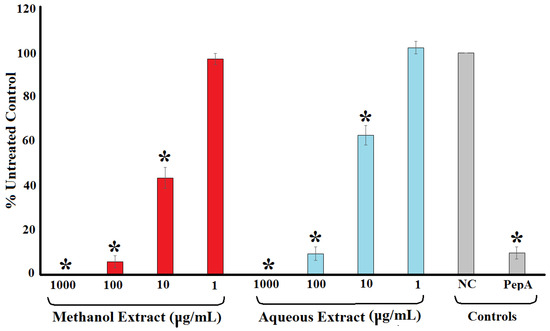 HIV-1 protease activity reduction following exposure to varying concentrations of methanolic and aqueous T. ferdinandiana fruit extracts expressed as % of the untreated control. Pepstatin A (10 μm) was included as a positive control. NC = untreated control; PepA = pepstatin A. All results are reported as the mean of three independent assays performed in triplicate ± SEM (n = 9). * indicates results that are significantly lower than the negative control (p < 0.01).
