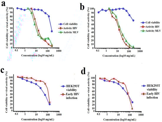 For assessing the inhibition of early HIV-1 replication, a similar assay was employed, as previously described [39,40]. Pseudoviruses were generated through co-transfection of HEK293T cells with three vectors: pMD.G(29) to facilitate viral entry, pCSFLW for the expression of tat-regulated firefly luciferase, and the HIV-1 gag-pol expression vector p8.9MJ4. Pseudoviruses were harvested 48 h post-transfection and titered in HEK293T cells. The p8.9MJ4 and pMDG vectors were obtained from Didier Trono (École Polytechnique Fédérale de Lausanne, Lausanne, Switzerland), and pCSFLW was obtained from Nigel Temperton (University College London, London, United Kingdom). For activity assessment, the extracts were dissolved in dimethyl sulfoxide (DMSO, Sigma-Aldrich, Germany) to 25 mg/mL and diluted to a 500 μg/mL working stock in complete DMEM. The working stock was added to duplicate wells of a 96-well culture plate (Sigma, Germany), and eight 2-fold serial dilutions (2–250 μg/mL final) were prepared in 50 μL of complete DMEM per well. After the addition of HEK293T cells (at 4 × 105 cells/mL) and pseudovirus to each well, the plate was incubated at 37 °C, 5% CO2, for 48 h.