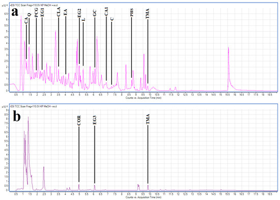 LC-MS chromatograms of methanolic T. ferdinandiana fruit extract in (a) positive and (b) negative ionisation modes with some noteworthy compounds highlighted. CA = chebulic acid; CLA = chlorogenic acid; C = combretastatin; CA1 = combretastatin A1; COR = corilagen; EA = ellagic acid; EG1, EG2, EG3 = ethyl gallate isomers; GC = gallocatechin; L = luteolin; PHS = pentahydroxystilbene; PCG = pyrocatechol glucuronide; TMA = trimethyl ellagic acid; Q = quercetin.