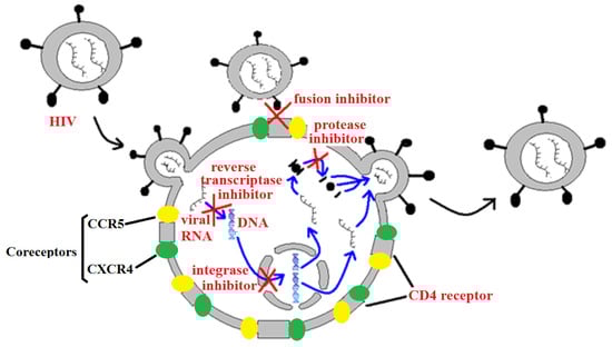 Anti-retroviral therapies (ARTs) to treat HIV infection may target a number of phases of the HIV replicative cycle (Figure 6). As of August 2019, the FDA had approved thirty antiretroviral drugs and fifty-five drug formulations for the management and treatment of HIV-1 in the USA. The first of these drugs was the nucleoside reverse transcriptase inhibitor zidovudine (AZT). However, the HIV-1 reverse transcriptase enzyme has since developed a proofreading function, rendering AZT relatively ineffective in some drug-resistant HIV-1 strains [4]. The majority of the drugs currently approved by the FDA also target the reverse transcription process, accounting for more than half of the approved single entity drugs. Thirteen nucleoside/nucleotide reverse transcriptase inhibitors (NRTIs) and six non-nucleoside reverse transcriptase inhibitors (NNRTIs) are currently available clinically. A further nine anti-retroviral drugs approved by the FDA are HIV protease inhibitors, and four drugs inhibit HIV integrase. Inhibition of the HIV cellular infection processes are currently poorly represented, with only a single approved drug targeting viral fusion to the cellular CD4 receptor, and a further drug targeting the CCR5 co-receptor. However, the rapid emergence of resistant HIV strains has rendered some of these therapies of substantially lower efficacy. There is an urgent need to develop new anti-HIV therapeutic agents.