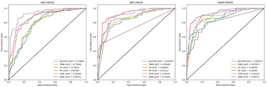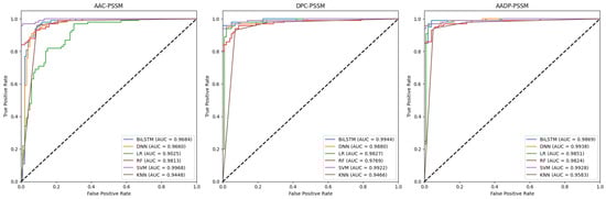 In this section, we employed six classifiers, i.e., logistic regression (LR) [39], random forest (RF) [40], SVM, k-nearest neighbors (KNN) [41], bidirectional long short-term memory (BiLSTM) [42], and deep neural network (DNN) [43], to compare the performance of six traditional feature representations, including AAC, dipeptide composition (DPC), their combination (AADP), AAC-PSSM, DPC-PSSM, and AADP-PSSM for the identification of ATGs. The dataset was randomly divided into two subsets with a ratio of 8:2. The 80% subset is the training set, while the remaining subset is the independent test set to validate the performance of the models. As a result, 36 baseline models were trained on the training set by the five-fold CV, respectively. And their performance was assessed using the following metrics: accuracy (Acc), precision (Pre), sensitivity (Sen), specificity (Spe), F1-score, and Matthews correlation coefficient (MCC) [44,45,46], presented in Table 1 and Table 2. Moreover, the corresponding receiver operating characteristic (ROC) curves and the area under the curve (AUC) values were shown in Figure 2 and Figure 3.