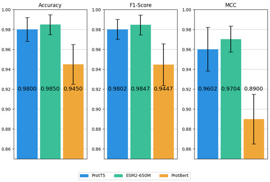 As depicted in Figure 4, three PLM embeddings exhibit robust performance across all metrics. Specifically, ESM-2 embeddings achieve the best results in terms of Acc (0.9850), F1-score (0.9847), and MCC (0.9704), indicating their superior capacity to distinguish ATGs. Similarly, ProtT5 embeddings show comparable efficacy with marginal performance differences, which suggests they have equivalent potential for this task. In contrast, ProtBERT embeddings underperform the other two PLM embeddings with an Acc of 0.9450, an F1-score of 0.9447, and an MCC of 0.8900. Moreover, we can find that models employing ESM-2 and ProtT5 embeddings surpass all baseline models, while ProtBERT embeddings underperform even conventional PSSM-based features. Based on these findings, ProtT5 and ESM-2 embeddings are identified as the most promising candidates for further analysis in the ATGs identification.