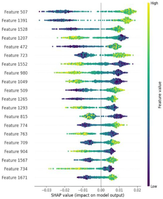 Although the combined feature set captured more information from multiple aspects, the potential redundant or irrelevant features may lead to the model overfitting and the training time increasing. Therefore, we investigated the impact of feature selection on the performance of the ATG identification. For this experiment, we employed SHAP analysis to quantify the contribution of individual features within the ESM-2 + AADP-PSSM feature set to the model’s output. Figure 5 presents a scatter plot of feature density, where each row represents a feature. Each colored point represents a sample, with yellow indicating higher feature values and purple indicating lower feature values. The horizontal axis shows the SHAP values, and the features are sorted according to the average absolute SHAP value of all samples. Those top-ranking features have a meaningful impact on the model’s output. Conversely, features with low absolute SHAP values are identified as potential sources of redundancy and noise, which may weaken the model’s overall performance.