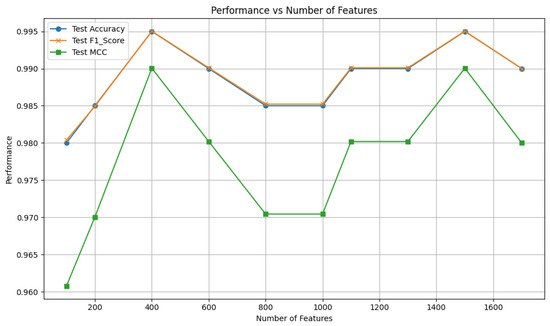 After ranking these features according to their SHAP values, we systematically evaluated feature subsets of varying dimensions by inputting the top K features into the SVM classifier to identify the most optimal feature subset, where K = 1700, 1500, 1300, …, 100. The performance of the SVM with different feature subsets on the independent test set was shown in Figure 6, from which we can see that the model achieves peak performance with an accuracy of 99.50% when K = 400 and K = 1500. The 400-D feature subset likely captures highly informative features, which effectively reduces redundancy while retaining crucial patterns. In contrast, the 1500-D feature subset may leverage additional complex patterns because of more features. Considering the trade-off between performance and computational efficiency, the 400-D ESM-S+AADP-PSSM feature subset was finally selected to feed into the SVM classifier for training, resulting in the PLM-ATG model.